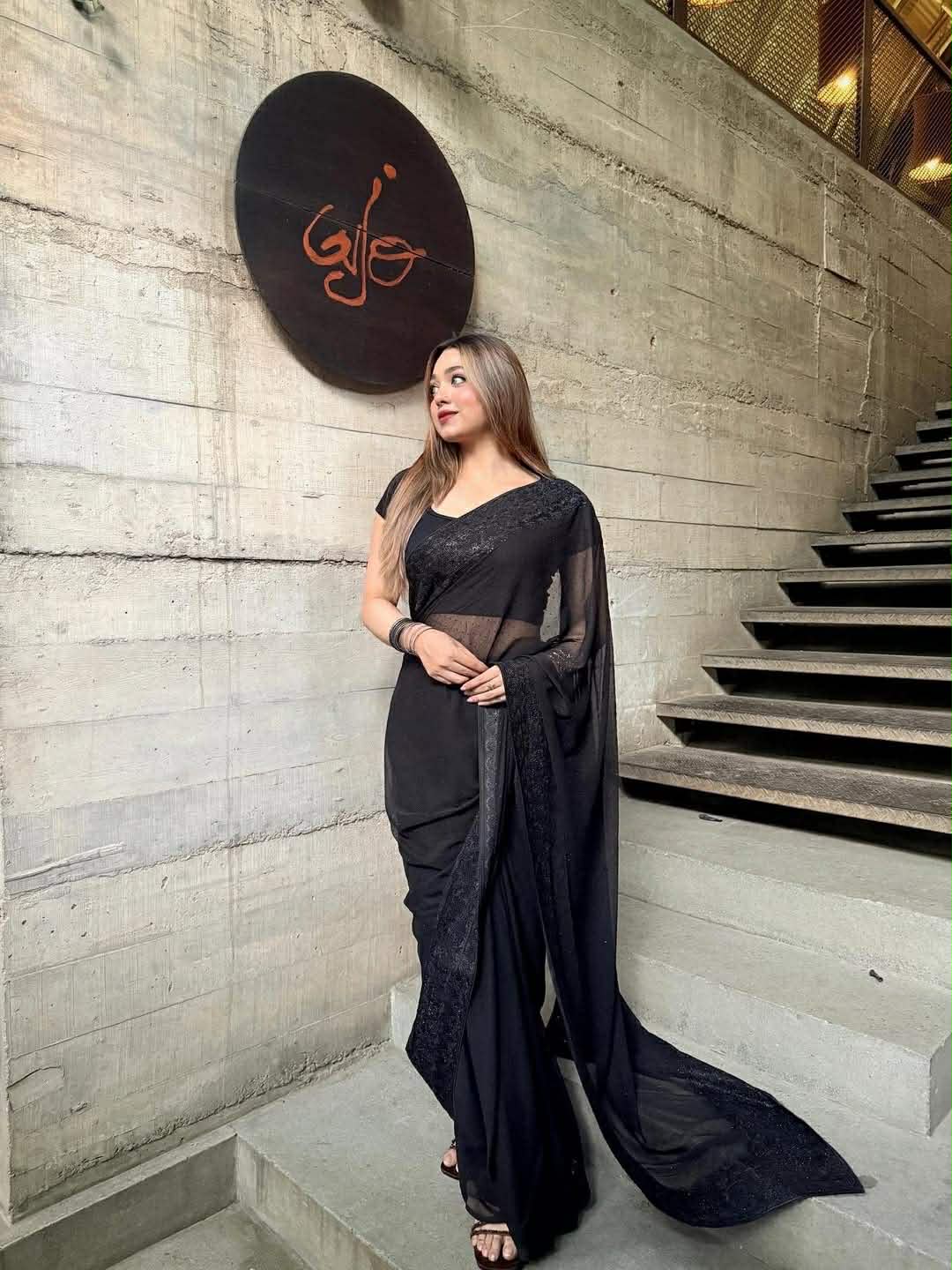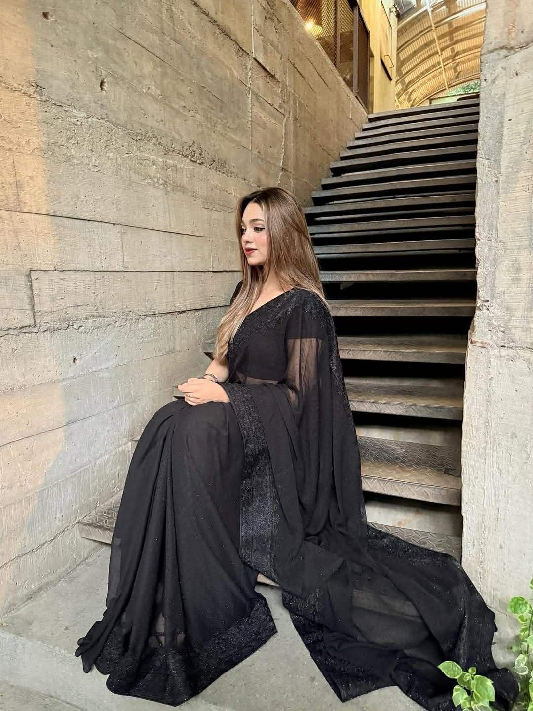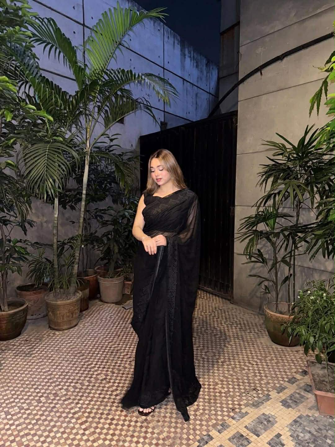 এই মনোমুগ্ধকর ব্ল্যাক ডায়মন্ড শাড়ি তৈরি হয়েছে প্রিমিয়াম ইন্ডিয়ান ওয়েটলেস জর্জেট ফেব্রিকে,